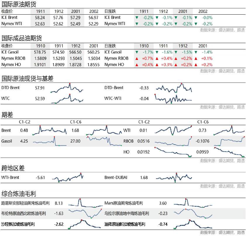 市场信息消息简述:应美方邀请,中共中央政治局委员、国务院副总理、中美全面经济对话中方牵头人刘鹤将率团访问华盛顿,于10月10日至11日同美国贸易代表莱特希泽、财政部长姆努钦举行新一轮中美经贸高级别磋商。此外,周二商务部新闻发言人就美商务部将28家中国实体列入出口管制“实体清单”发表谈话,并表示强烈不满和坚决反对。EIA将2020年全球石油日需求增长预估下调10万桶,至130万桶。EIA在月报中还称,今年美国石油日产量料增加127万桶,至1,226万桶,高于上月预估的增加125万桶。美国石油协会API发布报告称,上周美国原油库存增加,汽油和馏分油库存减少。API公布,截至10月4日当周,美国原油库存增加413万桶,调查的分析师预计为增加140万桶。API公布,上周汽油库存减少594万桶,调查的分析师预计减少25.7万桶。当周包括柴油和取暖油的馏分油库存减少398万桶,调查的分析师预估为减少210万桶。国际货币基金组织新任总裁格奥尔基耶娃周二表示,全球经济正陷入“同步放缓”,且警告称,如果各国政府不采取任何行动来解决贸易冲突和支持增长,全球经济将进一步放缓。国庆假期期间,因一系列令人失望的经济数据加重了投资者对全球经济的悲观预期,国际油价持续下行,包括美国9月份制造业活动降至逾10年低点,服务业增长大幅放缓至2016年以来首见的水平,制造业呈现的危机正蔓延到先前表现强劲的服务业,这降低了运输需求,利空油价。地缘政治方面,假期期间伊拉克国内动荡局势恶化,联合国大会之后美国和伊朗之间的“嘴炮战”又开始,同时OPEC成员国厄瓜多尔表示要“退群”事件和委内瑞拉国内政治经济僵局长期化的压力对国际油价起到一定支撑作用。风险溢价方面,要强调的是中东地区的紧张局势有降温迹象,国际原油的风险溢价将减弱,令其价格承压。据外媒报道,伊朗石油部长赞加内试图缓和与沙特之间的紧张关系,称利雅得石油部长为“朋友”,且表示,伊朗致力于该地区的稳定。全球贸易局势方面,据外媒10月2日报道,美国将对欧盟的飞机产品征收10%关税,对农产品和其他产品征收25%关税。