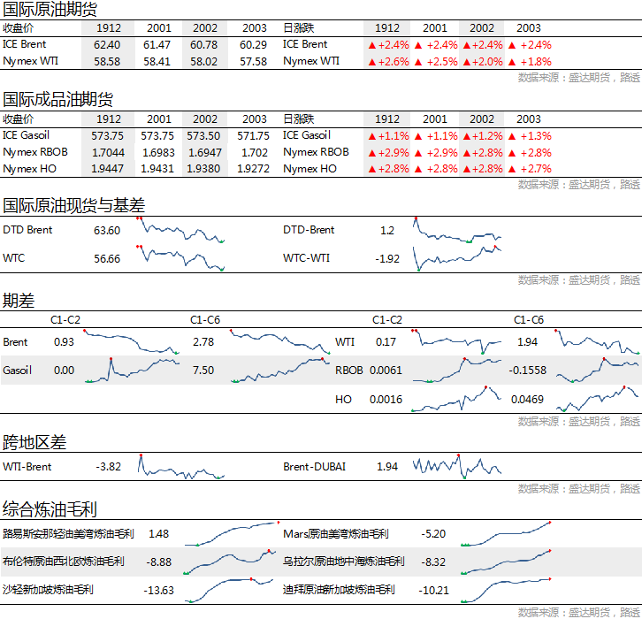 市场信息消息简述:消息人士称,欧佩克+在12月会议中,很可能延长现有的减产措施至2020年6月。经合组织:2020年全球经济增速预期为2.9%,此前预期为3.0%。前美联储主席耶伦:有充分的理由担心美国经济陷入衰退。微软发布声明称获得向华为出口软件的许可。法国巴黎银行:将2020年WTI原油均价预期上调3美元至54美元/桶,将2020年布伦特原油均价预期上调4美元至58美元/桶。预计2019年WTI原油均价为57美元/桶,布伦特原油均价为64美元/桶。原油行情展望: