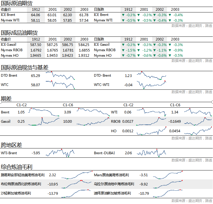 市场信息消息简述:11月28日消息,两名油田工程师表示,利比亚El Feel油田周四逐渐恢复生产,此前该油田因冲突而停产。以军事指挥官Khalifa Hafta为首的驻扎在利比亚东部的部队表示,在敌对组织周三短暂接管该地区后,他们已重新控制了该地区。俄罗斯一位高级石油官员表示,在周四与俄罗斯能源部长诺瓦克会晤前,俄罗斯石油巨头们提议维持产量配额至3月底,作为OPEC 产量协议的一部分。RavilMaganov在会后表示,石油巨擘们建议诺瓦克在3月底再次会面,讨论石油贸易。俄罗斯、其它非OPEC产油国和OPEC成员国将于12月5日至6日在维也纳讨论全球产量协议。过去三年,OPEC 一直在限制石油产量,以平衡市场并支撑油价。诺瓦克表示,俄罗斯对该协议的立场“目前是一个秘密”。该协议将于3月底到期。澳新银行表示,2019年美国原油产量或增加120万桶/日,至1219万桶/日。澳新银行预计,2019年布伦特原油价格为65美元/桶,2020年为70美元/桶; 2019年WTI原油价格为57美元/桶,2020年为65美元/桶。该行称,“我们预期OPEC在2020年不会进一步减产。”