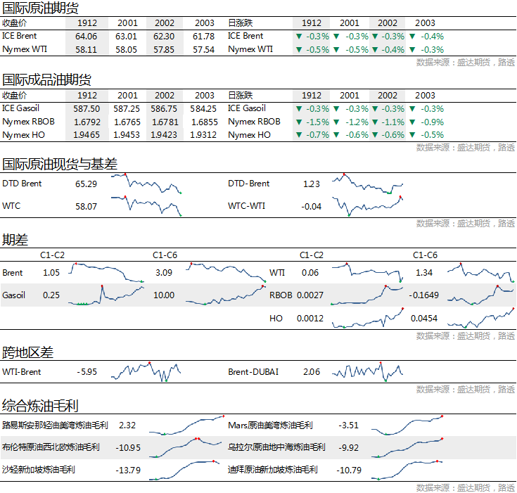 市场信息消息简述:美国能源信息署EIA周五公布的月报显示,9月份美国原油产量增加6.6万桶/日至1246.3万桶/日,升至纪录高位水平。8月份产量上修3.2万桶/日,至1239.7万桶/日。据塔斯通讯社报道,俄罗斯能源部长诺瓦克周五表示,他希望石油输出国组织OPEC及其非OPEC盟友在接近4月时就是否延长石油减产协议作出决定。这一提议可能会遭到大多数OPEC成员国的反对,他们目标在12月5日至6日与非OPEC成员国在维也纳举行的会议上达成一项新的产量协议。OPEC成员国和非OPEC石油出口国三年来一直在协调产量,以平衡市场并支撑油价。当前的减产协议定于3月末到期。报道引用诺瓦克的话称:“现在谈还为时过早,我们的协议到4月1日才到期。现在仍是11月份。为什么我们要在11月问关于4月的问题呢?”俄罗斯及OPEC消息人士称,在维也纳举行的会议上,俄罗斯可能会呼吁其他产油国改变对俄罗斯石油产量的测量方式。俄罗斯希望在计算产量时,将轻质油气凝析油排除在测量范围之外。外媒11月29日消息,一份调查显示,石油输出国组织OPEC国家11月原油产量下滑,因安哥拉产量因检修下滑,且沙特阿拉伯在其国家石油公司沙特阿美首次公开招股IPO之前持续限制供应以支撑市场。调查均值显示,OPEC 14个成员国本月生产原油2,957万桶/日。这较10月份的修正值减少11万桶/日。上周五,国际原油期货价格大跌,因从媒体报道出的各方消息看OPEC将扩大减产排除在计划外,但投资市场普遍认为只有深化减产才有可能达到石油市场的供需平衡,所以是提前对结果的计价。